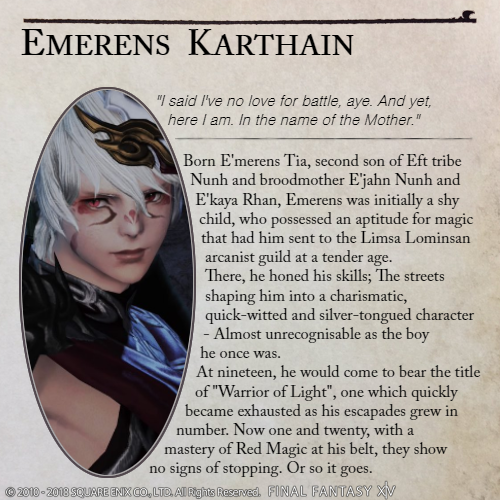From Coerthas, to Dravania, to Ala Mhigo and the Far East... And then to a different world entirely, the title of 'Eikon Slayer' has worn thin its welcoming. Where once Emerens held his head with pride upon the slaying of a primal, now his shoulders have begun to feel the weight of his exhaustion. The fame a poor comfort knowing his use as a weapon.The lulls in between great battles have found him wandering the streets and taverns of the world in shrouded secrecy, posing as yet another adventurer for hire. Or just another wanderer, in search of mischief, normalcy and perhaps a good drink.
