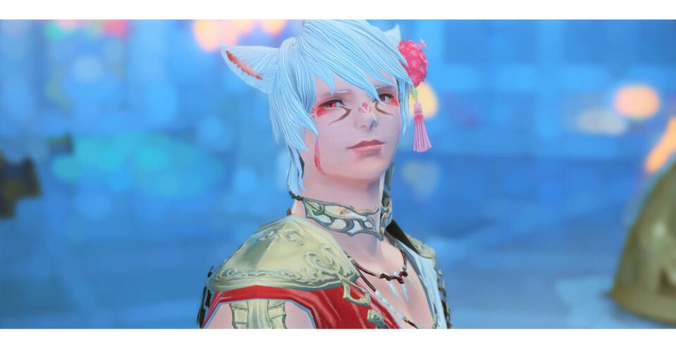 White haired, light skinned and red eyed, traits observed from the Eft Tribe of Bloodshore, Emerens' colouring traces its origins back to the early days of Miqo'te settlers. When his ancestors once called Coerthas home.His 'fur' is impeccably soft, with a slight curl to his hair that never seems to straighten. He possesses a particularly long tail, constantly groomed, which offers excellent balance.Of smaller stature, Emerens' clothing consists of form-fitting, revealing maroon cloth. Hinting at a relatively fit/toned and scarred figure — The most notable being from a large, diagonal wound across his chest; Much of his skin is covered in red tattoos and paint, some arcane in origin, whilst others tribal.At a closer glance, Emerens' right eye is of a lighter shade than his left. A result of aether scarring that removed its sight and original hue; Following the accident, only his left eye healed.