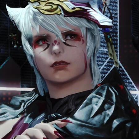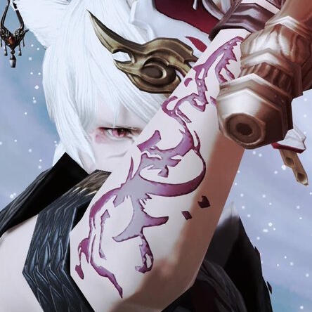 White haired, light skinned and red eyed, traits observed from the Eft Tribe of Bloodshore, Emerens' colouring traces its origins back to the early days of Miqo'te settlers. When his ancestors once called Coerthas home.His 'fur' is impeccably soft, with a slight curl to his hair that never seems to straighten. He possesses a particularly long tail, constantly groomed, which offers excellent balance.Of smaller stature, Emerens' clothing consists of form-fitting, revealing maroon cloth. Hinting at a relatively fit/toned and scarred figure — The most notable being from a large, diagonal wound across his chest; Much of his skin is covered in red tattoos and paint, some arcane in origin, whilst others tribal.At a closer glance, Emerens' right eye is of a lighter shade than his left. A result of aether scarring that removed its sight and original hue; Following the accident, only his left eye healed.